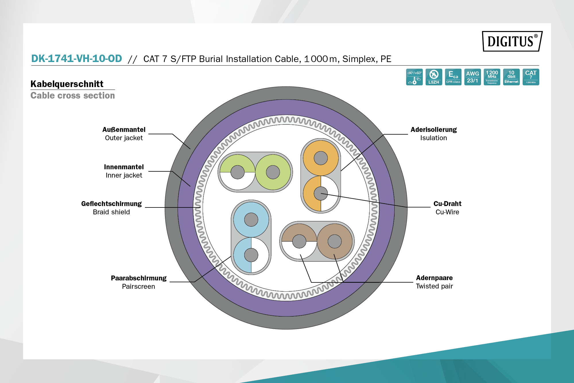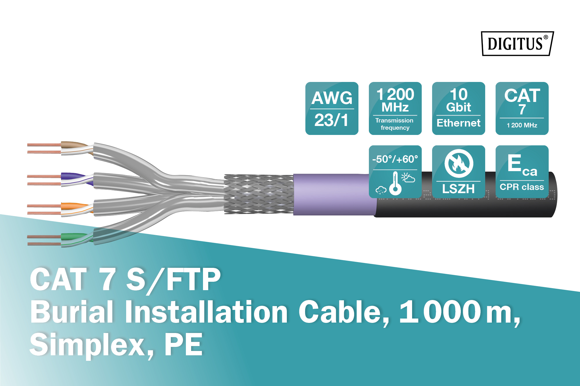 DIGITUS Cat.7 S/FTP burial installation cable. 1000 m. simplex. PE Product number: DK-1741-VH-10-OD EAN: 4016032354130 CAT 7 S-F