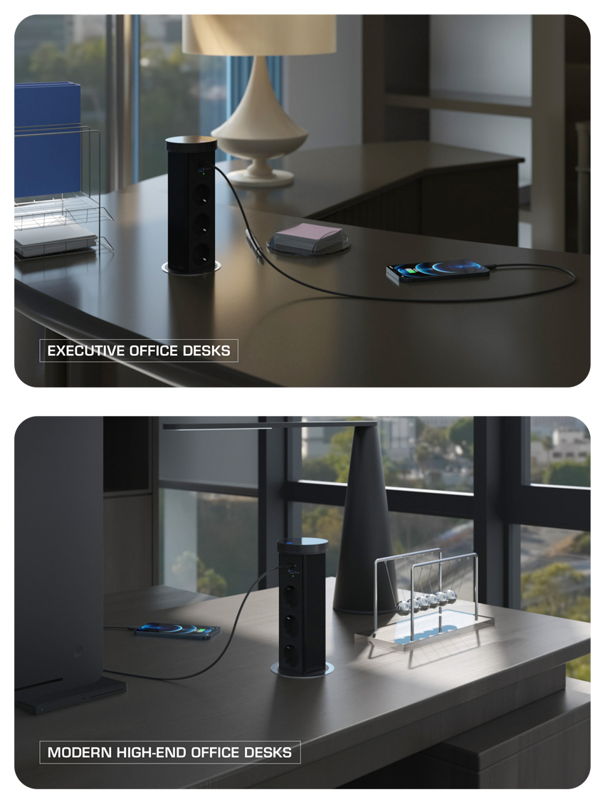 Motorised pop up unit With ultra-slim profile Color: Black With tempered glass cover top. Modules: 3*F6-DBM1 (Schuko. 45°) + 1*F