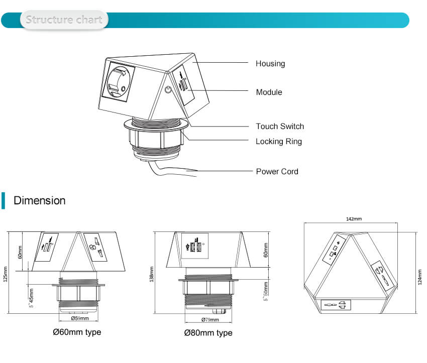 On-desk power station Color: Black Material: PC Modules: 2*F6-DWM1 (Schuko. 45°) + 1*F21-C6WM (USB A+C charger. 21W. 4.2A/5W) Wi