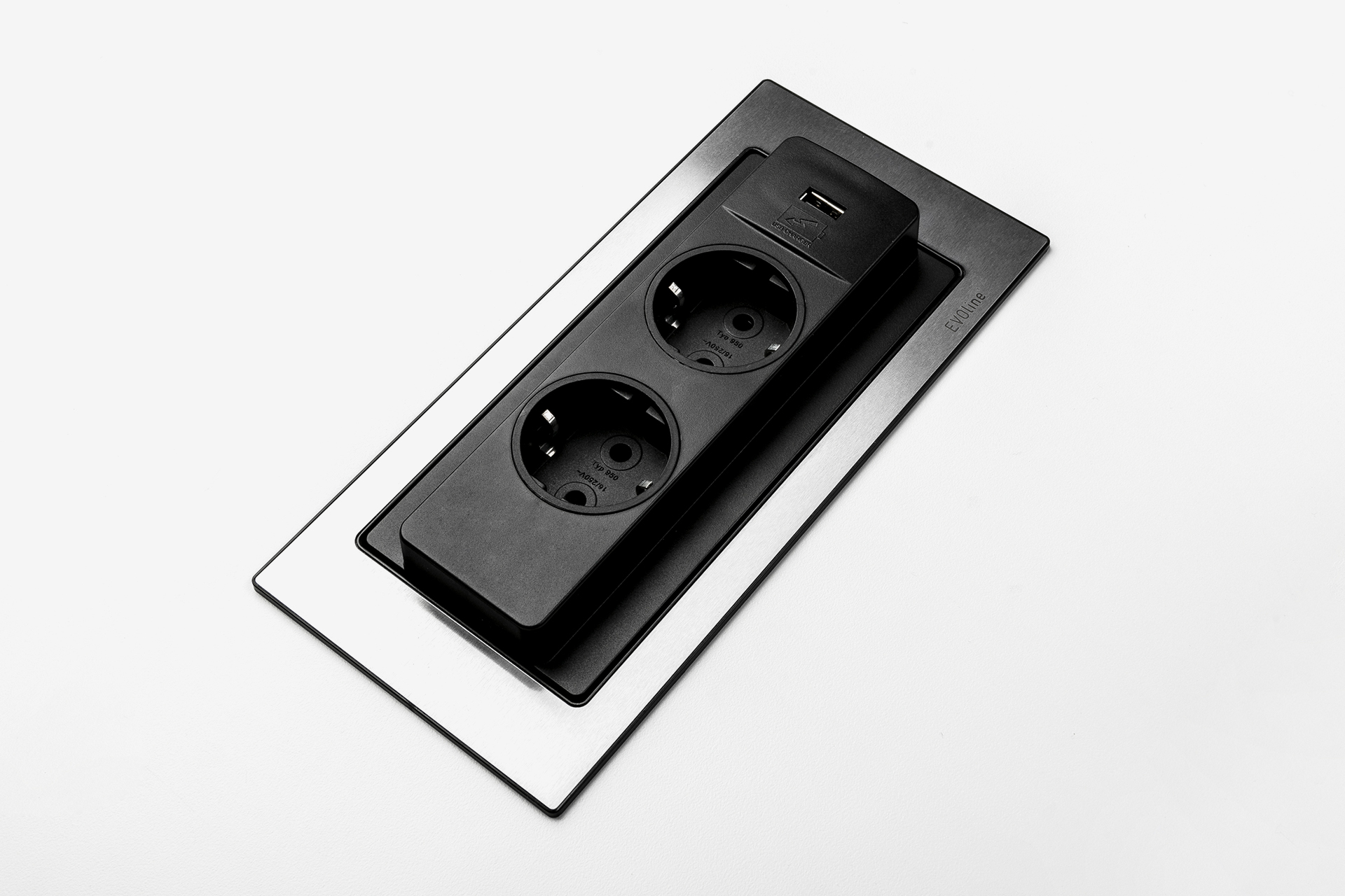 EVOline BackFlip CUISINE 2 × sockets. VDE-compliant. 0°. 16 A. contact-protected 1 × USB Type A or C charger. 5V / 2.1A Fixed p