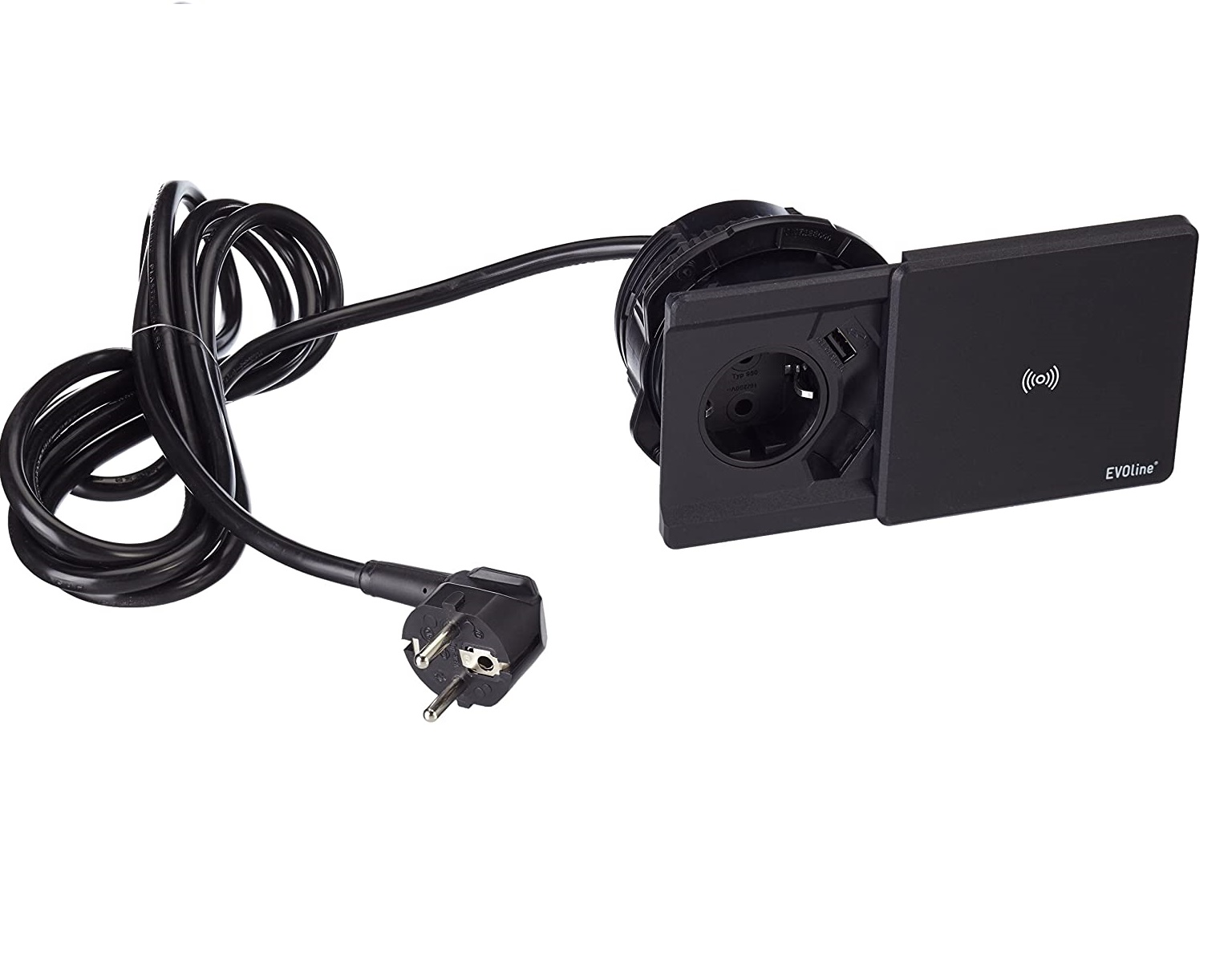 Built-in socket Square80. 1x power + 1x USB Type A + wireless charging. 3m cable. black