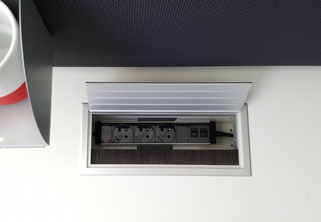 บล็อกปลั๊กไฟและอุปกรณ์จัดเก็บสายไฟในพื้นที่ทำงาน