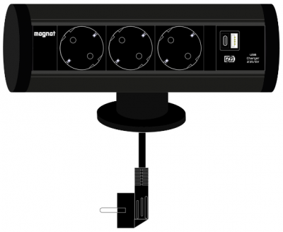 Socket Magnat-Tube. 3x 230V. 1x USB A+C 5V/2.1A. 3m cable. black