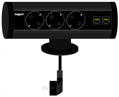 Socket Magnat-Tube. 3x 230V. 2x RJ45. 3m cable. black